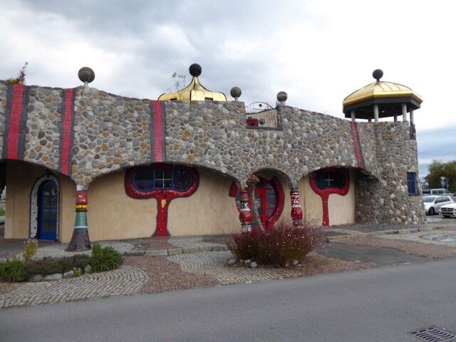 Nach St-Gallen, fahren wir weiter Richtung Lindau. Auf dem Weg, machen wir ein Halt in Altenrhein wo sich eine Markthalle befindet, die vom Architekt Friedensreich Hundertwasser gebaut wurde. Und sie befindet sich auch mitten in einem Supermarkt Quartier. Und irgendwie passt dieses Gebäude nicht ganz mit seinem Umgebung. Auf die andere Seite, kann man es kaum verpassen