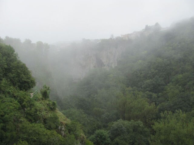 Retour de la pluie après deux jours ensoleillés à Opatija. Dommage, mais comme de toute manière nous avions prévu de changer de côte, passer de l’est à l’ouest de l’Istrie, le temps maussade n’a pas trop pesé sur le moral. Sur la route, nous faisons halte à Pasin. Cette bourgade du centre de l’Istrie cultive la personnalité de Jules Verne. Alors qu’il n’a jamais mis les pieds en Istrie, l’auteur a placé à Pasin le début de l’une de ses histoires, celle de Mathias Sandorf. Il est emprisonné au château et s’échappe par la rivière qui se jette dans le gouffre de Pasin. Jules Verne fait réapparaître son héros dans le golfe de Limski, bien que, depuis, il a été prouvé qu’il n’y a aucun lien entre la rivière de Pasin et Limski. Et tous cas, la météo nous a mis dans l’ambiance du roman.