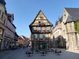 Après une première halte à Berne, nous envisagions un voyage assez direct avec une visite de Lübeck. La réalité du trafic nous a obligé à revoir nos priorités. Grève des cheminots allemands, donc beaucoup de monde sur les routes et autoroutes, donc bouchons et ralentissements et donc après une première étape qui nous a mené bien moins loin que souhaité, nous décidons dès le lendemain de changer de voie. Un peu plus à l’est, moins d’autoroute et un arrêt intermédiaire à Quedlinburg. La petite cité figurait parmi notre liste de lieux à visiter à l’occasion, laquelle s’est présentée fort à propos. Inscrite au patrimoine mondial de l’Unesco, Quedlinburg recèle un nombre impressionnant de maisons à colombage (ou à pans de bois) toutes plus charmantes les unes que les autres. Une visite que nous ne regrettons pas malgré le léger détour qu’elle a occasionné.