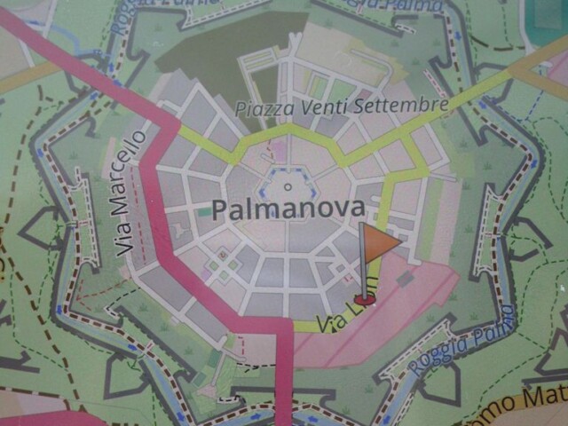 Notre voyage se poursuit vers le nord. Mais avant de faire halte en Autriche, nous voulons visiter Palmanova. Cette ville fortifiée en étoile devait être bâtie selon le modèle de la ville idéale de la Renaissance. Ce qui fut vraisemblablement le cas lorsque l’on regarde les photos aérienne. Elle fut surtout une ville de garnison. Elle a servi de forteresse jusqu’à la première guerre mondiale. Le plan de la ville laissait envisager une visite assez intéressante. En fait, une fois dans les rues, difficile de constater le plan de construction. Mais il est vrai que sur la place centrale on voit assez bien les angles. Ceci dit, la ville n’a aucun charme particulier, même si elle a été classée monument historique en 1960. Seule une balade hors-les-murs dans les douves et sur les remparts extérieurs offre quelques jolies vues.