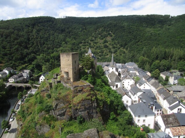 Esch-sur-Sûre, die Perle der Ardennen, sagt die Werbung. Und diese Perle wollten wir uns anschauen. Unter einem grauen Himmel, ist es schwierig von Perle zu reden, aber mit einem Sonnenstrahl sieht das ganze recht anders. Das Dorf rollt sich zusammen in einer Schlaufe der Sauer. Nach dem Installation auf dem netten Campingplatz Im Aal, können wir das Dorf besuchen, 10 Minuten zu Fuss.