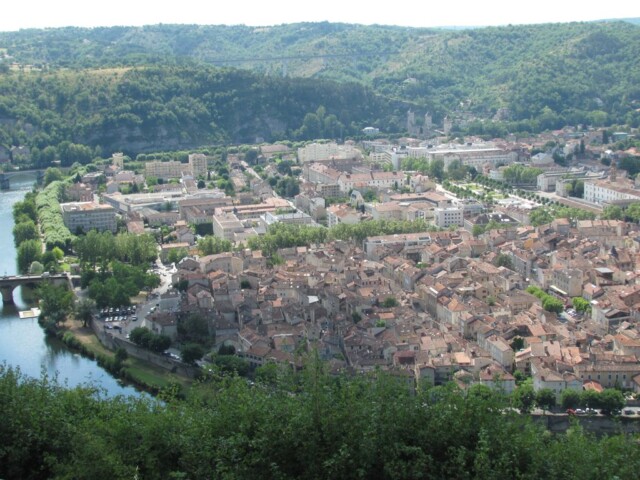 Cahors est la capitale du département du Lot. Blottie dans un méandre de la rivière, la ville est clairement divisée en deux espaces. A l’est la vieille ville avec ses maisons serrées et ses ruelles étroites. A l’ouest la ville plus récente, plus espacés. Cahors mérite une visite. On y découvre une localité assez charmante, aux multiples jardins que l’on découvre au détour d’une rue, ou dans une cour intérieure. A notre arrivée, la place de la cathédrale est recouverte par les stands du marché, donnant à l’espace une ambiance particulière. Notre balade nous a surtout fait déambuler dans la vieille ville. Nous avons constaté que le pèlerinage de Compostelle passait par ici.