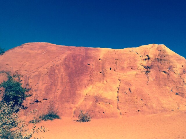 Lundi cap vers la destination la plus éloignée du camping: Rustrel. C’est là que nous découvrons ce que les guides nomment le « Colorado provençal ». Et de fait, la dénomination n’est pas usurpée. Certes, la surface, la taille ne sont pas à mettre en comparaison avec le véritable Colorado, mais l’impression y est tout à fait. Le temps d’une marche de deux bonnes heures, pique-nique compris pour une demi-douzaine de kilomètres, assure un dépaysement complet. Ici, la terre prend toutes les teintes, du blanc au rouge. Une terre chargée d’ocre qui a fait la réputation de la région durant des décennies. L’exploitation à ciel ouvert abandonnée, la nature s’est chargée de modeler un paysage tout à fait improbable que l’on ne s’attend pas à voir en cet endroit.