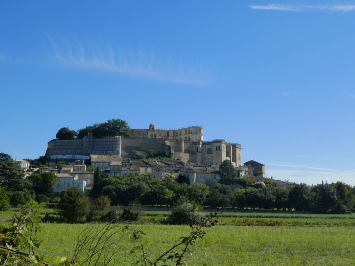 Un petit tour dans les baronnies provençales le jour suivant avec un première halte à Nyons, la capitale de l’olive. Et c’est aussi jour de marché. La jolie petite ville nous offre une vision qui n’est pas sans évoquer quelque chose dans notre esprit. Les arcades de la place centrale ont un petit quelque chose de familier. Et l’impression va se renforcer un peu plus loin à Buis-les-Baronnies. Ici c’est une rue qui est bordée d’arcades à gauche et à droite. Il y a un petit quelque chose de Berne ou de Morat. Et, comme nous l’apprenons, ce n’est pas un hasard.  Selon les historien, Louis XI a fait appel à des Suisses allemands pour repeupler la région après la grande peste du 14e siècle qui a décimé près des deux tiers des habitants. Et ces Suisses ont bâti selon leurs propres canons architecturaux, avec des arcades. La route nous fait passer par Pierrelongue où on découvre une sorte de clone de la chapelle St Michel d’Aiguilhe du Puy-en-Velay.