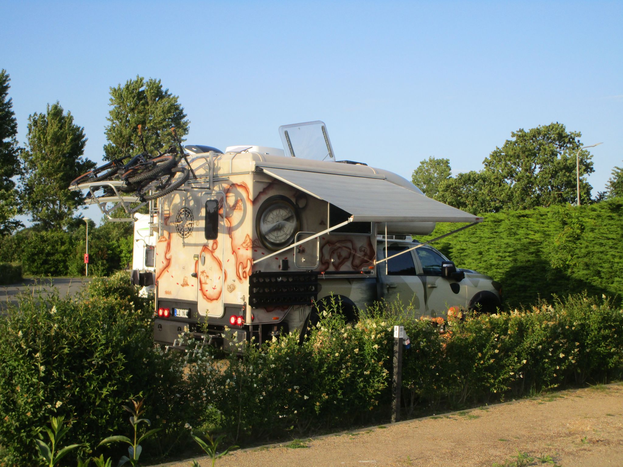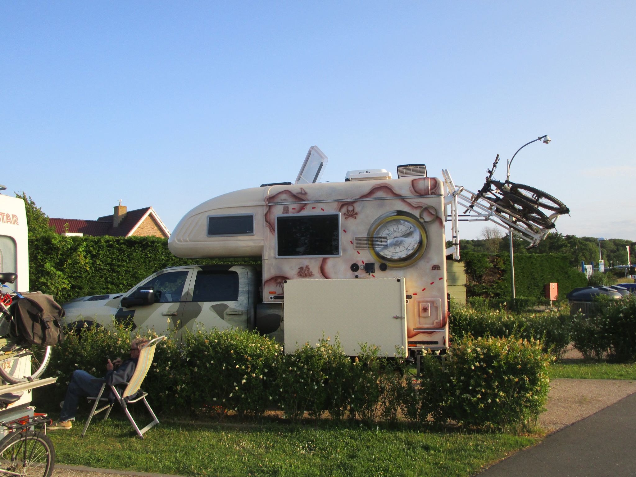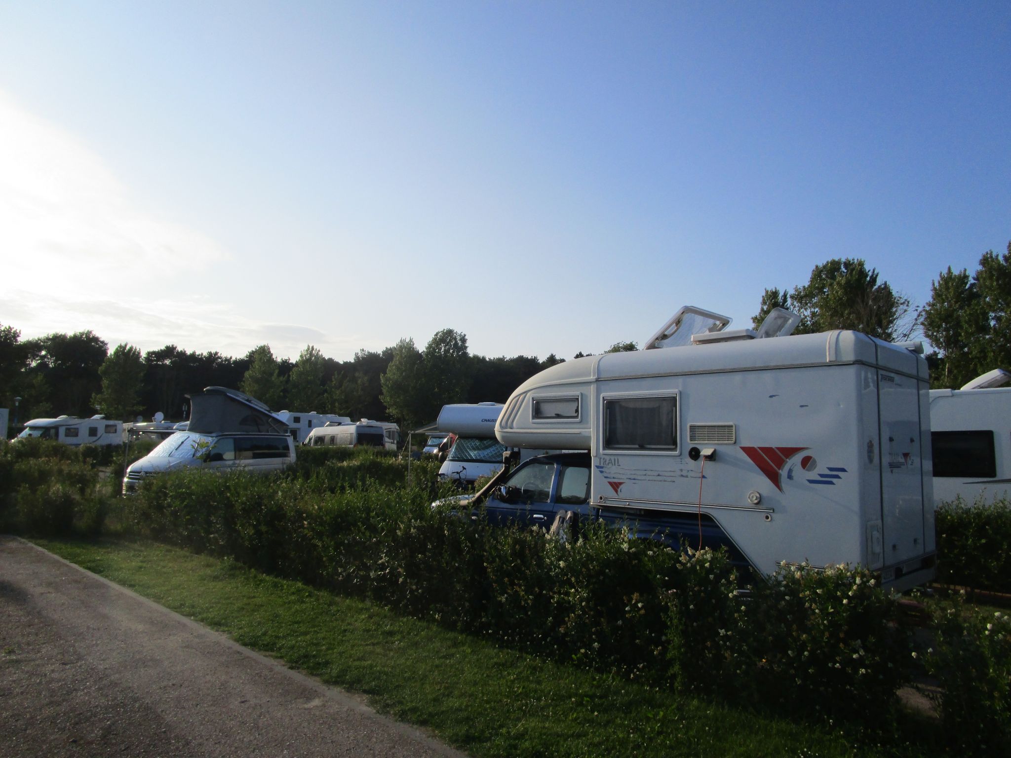Une nuit sur l’aire de camping car de Brouwersdam, spacieux, douche, WC, vidange, électricité, mais il restait bien peu de places. Nous croisons deux cellules Tischer et en profitons pour causer un peu. Et nous apprenons qu’une grande partie de l’Allemagne, surtout au nord, est en vacances, et la météo explique aisément l’affluence.